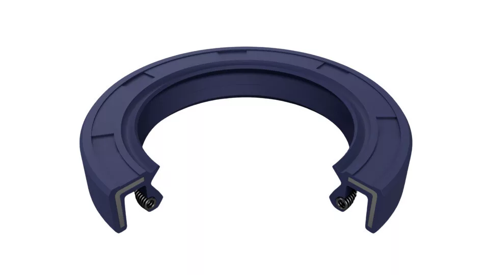 Forgótömítés hagyományos kialakításban védőperemmel a külső oldalán és elasztomer külső köpennyel, amely fém betétettel és rugóerősítésű tömítőperemmel is rendelkezik.