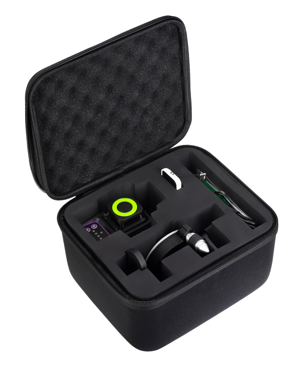 A nagy fényerejű lézerdiódák 12 db 3D-s zöld lézervonalat vetítenek, a lézer vízszintesen és függőlegesen 360°-os szöget fed le. A nagy munkatávolság akár nagy területek hatékony jelölését is lehetővé teszi. A készülék a távirányító segítségével távolról is működtethető.