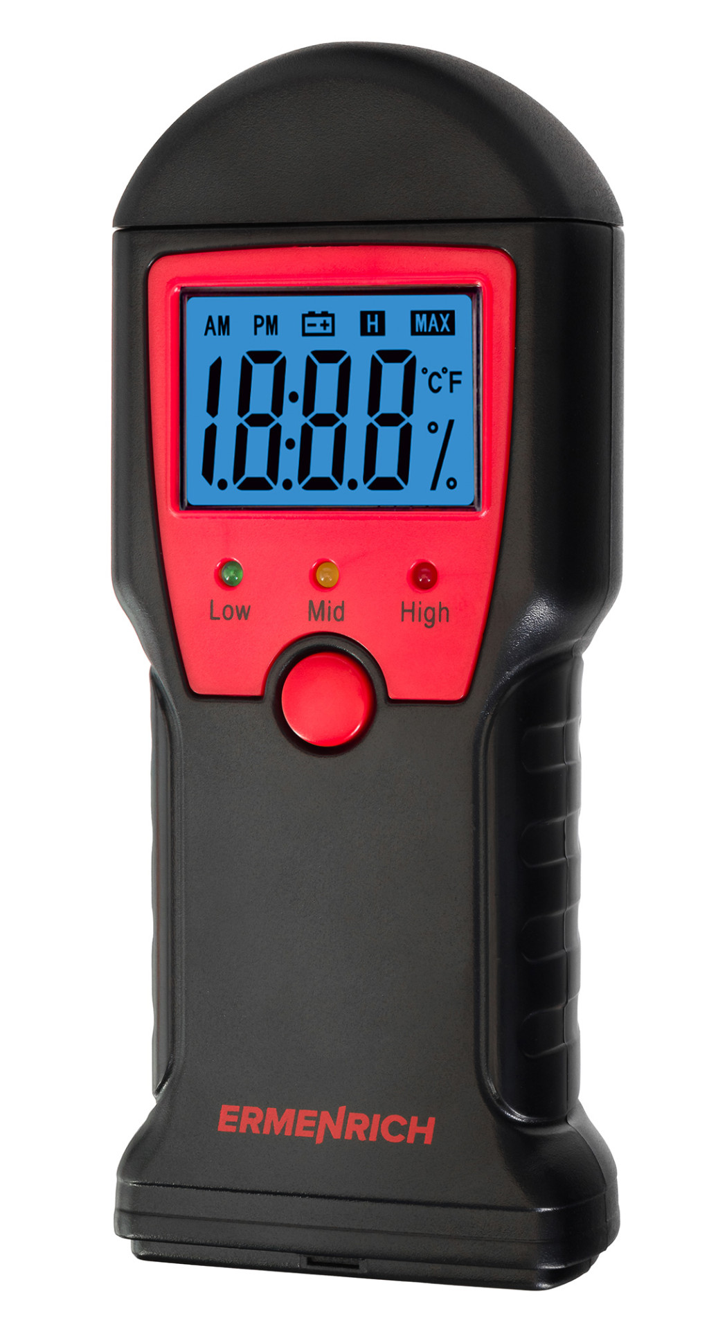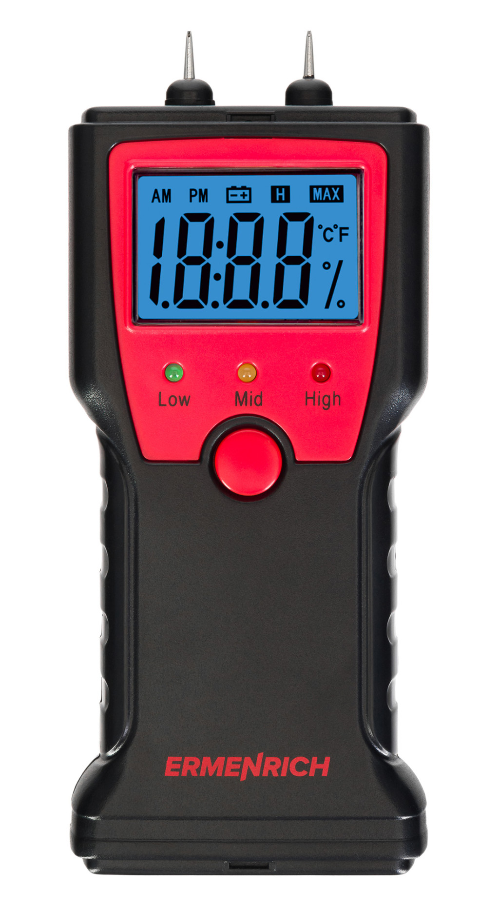 Az Ermenrich Wett MW10 egy tűs nedvességérzékelő, melynek segítségével meghatározható a fa, építőipari keverékek és habarcs nedvességtartalma. Az eszköz Celsius vagy Fahrenheit fokban is képes mérni a hőmérsékletet. Egyszerűen, egyetlen gombbal vezérelhető. A mért értékek nagy számjegyekkel és élénk kék háttérvilágítással jelennek meg a beépített képernyőn. A képernyő alatt három LED-jelzőfény található, amelyek átfogó értékelést adnak arról, hogy mennyi nedvesség van az anyagban: a zöld alacsony, a sárga fokozott, a piros pedig magas nedvességtartalmat jelent.
