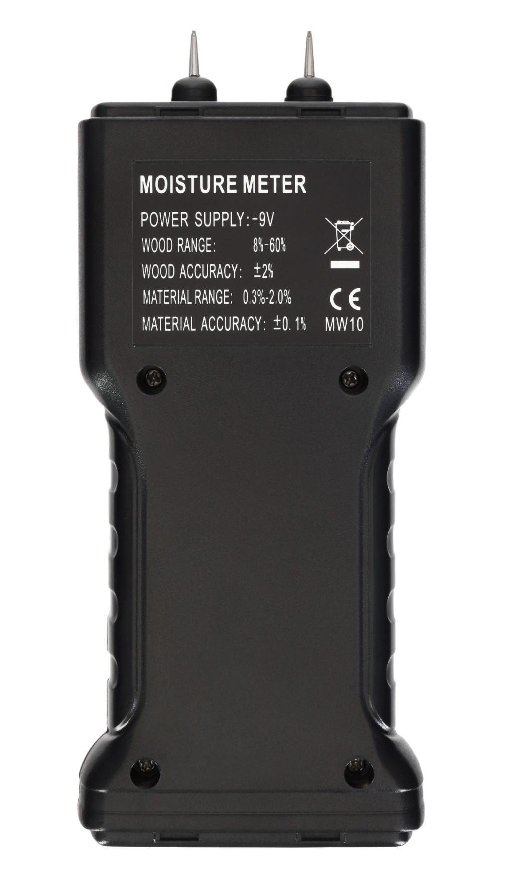 Az eszköz meglehetősen kompakt és könnyű, így könnyedén megtarthatja a kezében. A mérőtűk a levehető fedél alatt vannak elrejtve. Alul egy elemtartó rekesz található egy 9 voltos elem számára. Az érzékelő automatikus kikapcsolási funkcióval, valamint az elem üzemidejének ellenőrzésére a képernyőn ikonként megjelenő alacsony töltésszint-jelzővel is rendelkezik.
