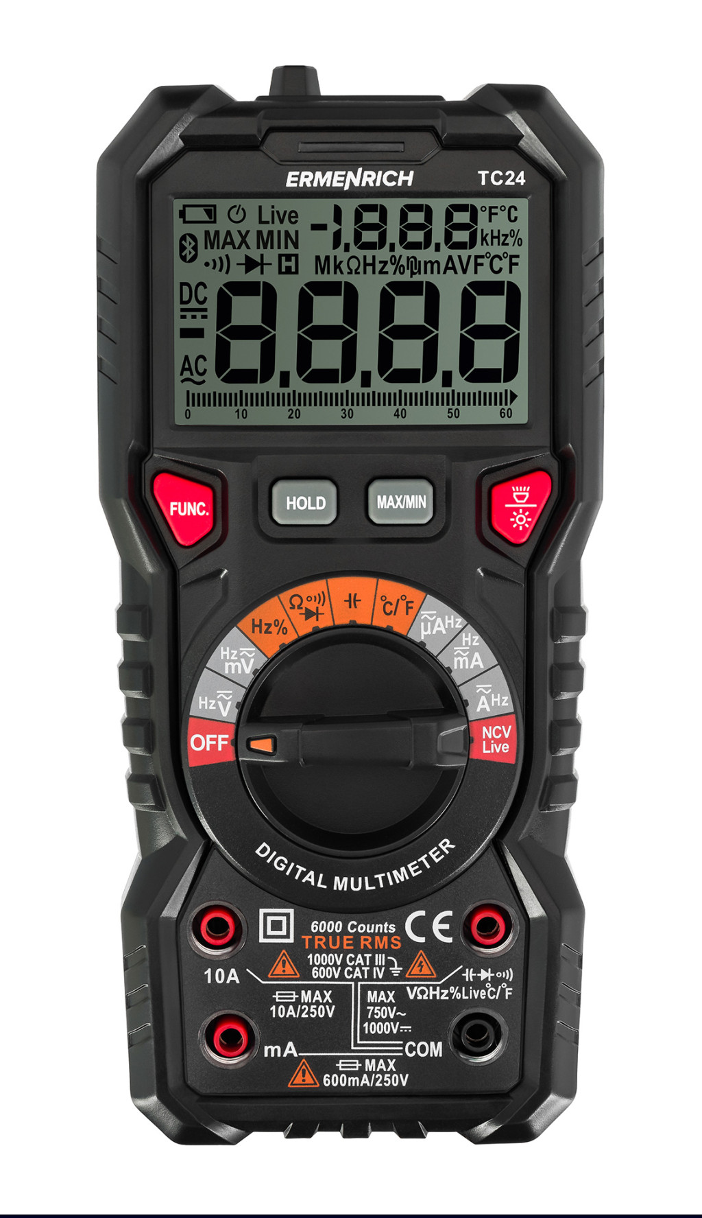 Az Ermenrich Zing TC24 digitális multiméter egy professzionális eszköz az elektromos hálózatok és berendezések tesztelésére, valamint olyan paraméterek mérésére, mint az ellenállás, a feszültség, az áramerősség, a munkaciklus, a frekvencia, a kapacitás és a hőmérséklet. A True RMS számítás nagy mérési pontosságot biztosít. Az automatikus határérték-választás megkönnyíti a készülék használatát. A multiméter egy olyan kompakt és megbízható eszköz, amelyet szabványos elemek működtetnek.