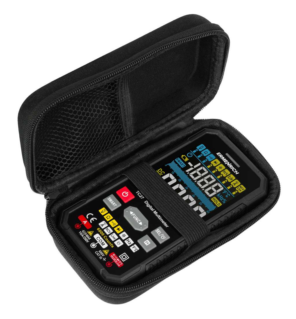 Az Ermenrich Zing TC27 digitális multiméter elektromos berendezések és elektromos áramkörök tesztelésére szolgál. Széles körű funkciói lehetővé teszik, hogy ne csak otthon, hanem professzionális munkavégzéskor is használja. A multiméter kiváló választás mérnökök, villanyszerelők, szerelők és más szakemberek számára. Az Ermenrich Zing TC27 multiméter egy True RMS eszköz, amely garantálja a nem szinuszos jelek rendkívül pontos mérését.