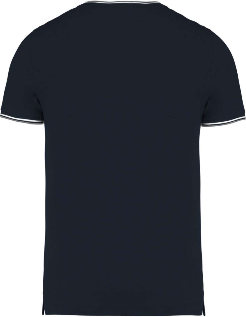 Férfi V-nyakú és rövid ujjú piqué póló 100% fésült pamut piqué anyagból. A póló nyakán és az ujjak végén kontrasztos csíkok vannak. A póló anyagsűrűsége 170 gr/m2.