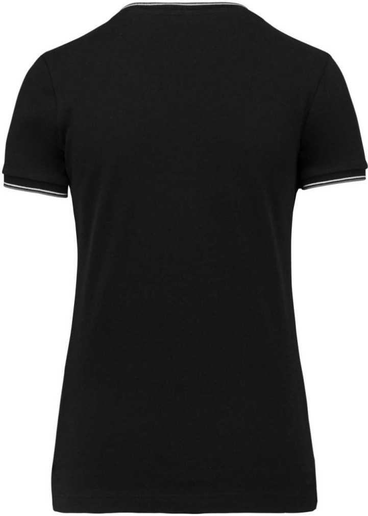 Női rövid ujjú V-nyakú piqué póló 100% fésült pamut anyagból. A póló anyagsűrűsége 170 gr/m2. A póló nyakán és mandzsettáin kontrasztos csíkok találhatóak.
