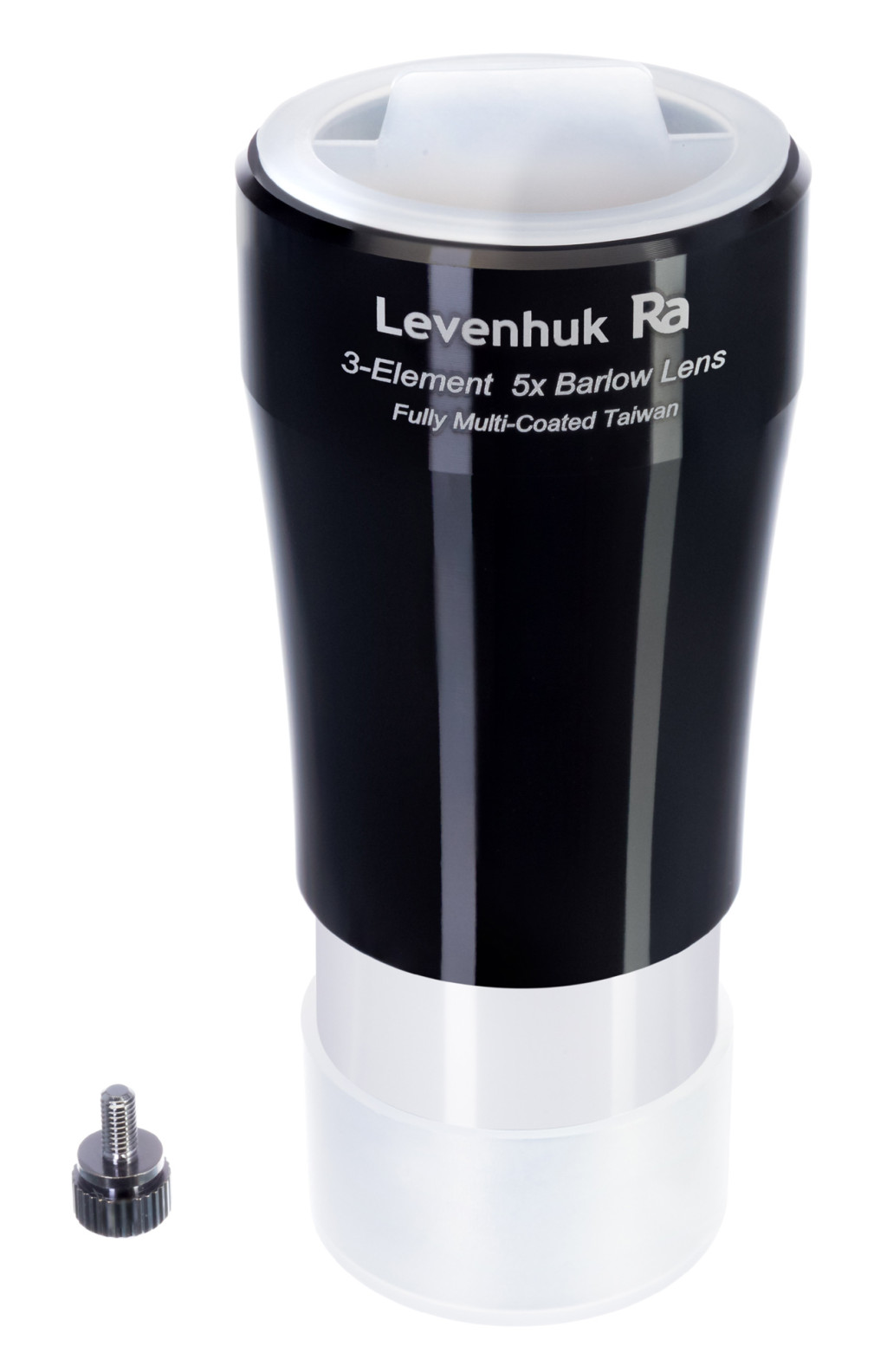 A Levenhuk 5x Barlow-lencse egy háromelemes apokromatikus lencse, amelynek minden optikai eleme többrétegű bevonattal rendelkezik. Ezek az optikai elemek bármely teleszkóp nagyítását az ötszörösére növelik. Ez a lencse hatásosan megszünteti az optikai torzítást, és a teljes látómezőben tiszta és éles képet állít elő. Bármilyen teleszkóppal és szemlencsével kompatibilis. Szűrőmenettel is rendelkezik.