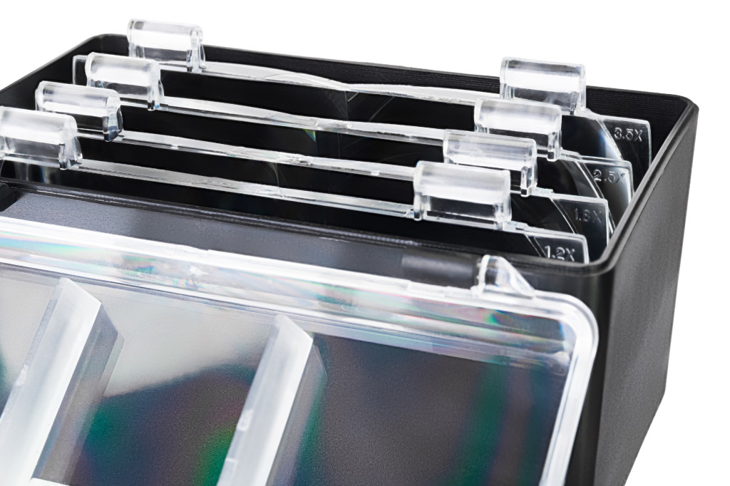 - Fejre rögzíthető nagyító cserélhető, egymással kombinálható lencsékkel