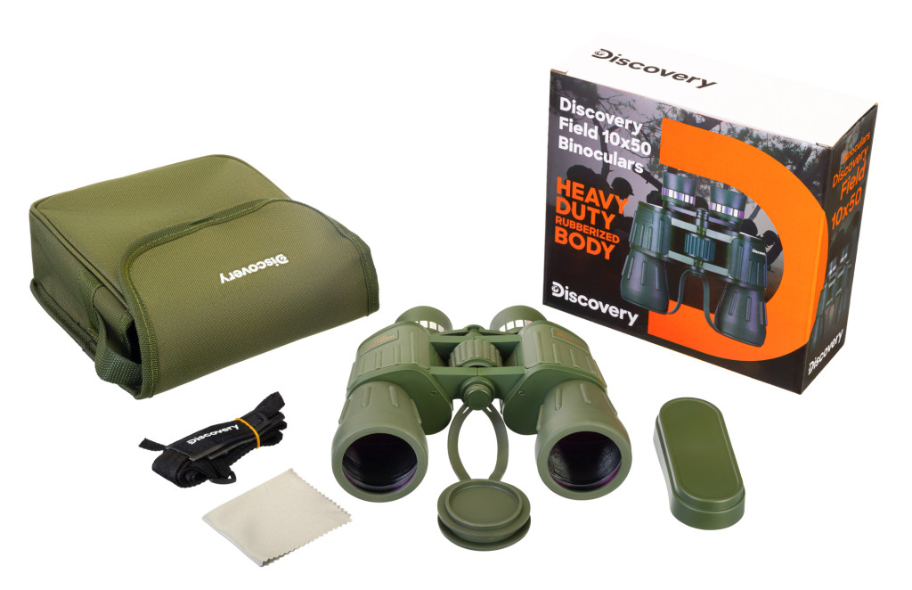 A Levenhuk Discovery Field 10x50 optikája BK-7 típusú optikai üvegből készült, a váza tartós, gumírozott műanyag. Az optikai és mechanikus alkatrészek kellően védettek az esetleges sérülésktől és nedvességtől. Külső, texturált felülete miatt még vizes kezekből sem csúszik ki. A kétszemes távcsövet könnyű beállítani – mindössze a fókuszt kell módosítani az objektívlencsén a központi fókuszállító tubussal, majd megigazítani a dioptriát, ha szükséges, és készen is van. Álló helyben történő megfigyelésekhez a kétszemes távcső háromlábú állványra is szerelhető (standard 1/4-es csatlakozó).