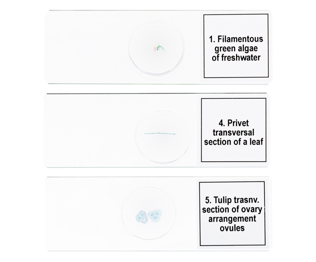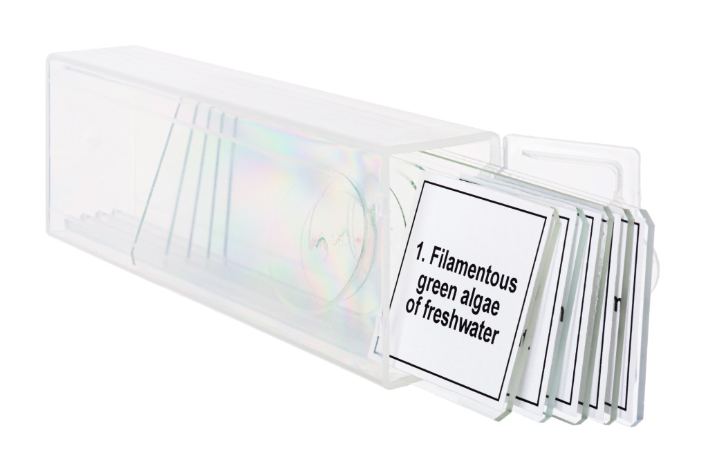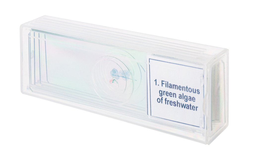 A Levenhuk Discovery Prof DPS 5 mikropreparátum mintakészlet. A „Biológia” megnevezésű összeállítása öt darab professzionális besorolású tárgylemezt tartalmaz növényi szövetekkel, algákkal és gombák szöveteivel.