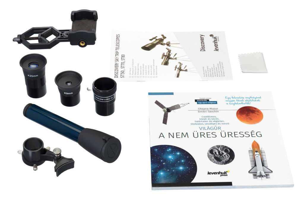 A Levenhuk Discovery Sky Trip ST80 könnyen használható, hiszen a teleszkóptubus egy egyszerű alt-azimut tartószerkezethez van rögzítve, ami lehetővé teszi az azimut és az elevációs mozgatást is. A teleszkóphoz számos optikai tartozék jár, beleértve egy Barlow-lencsét, több szemlencsét, egy keresőtávcsövet, valamint egy diagonális prizmát. Az okostelefon-adapterrel fényképek és videók készíthetők. Fedezze fel első teleszkópja képességeit: hangolja be a beállításokat különféle égitestek megfigyeléséhez, valamint rögzítse eredményeit és ossza meg őket ismerőseivel. A kisméretű, beépített iránytű megkönnyíti a földi navigálást.