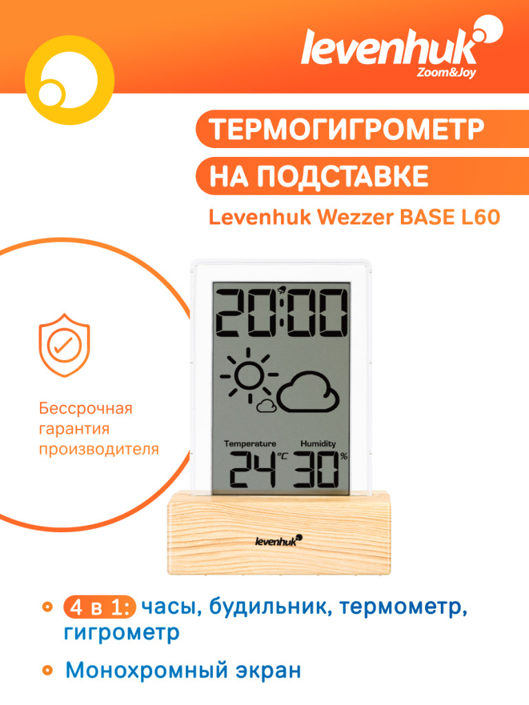 Mivel a Levenhuk Wezzer BASE L60 elemről működik, nem kell a hálózathoz csatlakoztatni és így vezetékek sem fognak a padlón futni. A páratartalomra és a hőmérsékletre vonatkozó értékek mellett a berendezés az öt időjárás-előrejelzési ikon egyikét is képes megjeleníteni. A kijelző tetején nagy számjegyeket megjelenítő óra található, amely távolról is jól leolvasható. Ez az okoseszköz könnyedén válhat az éjjeliszekrényen álló ébresztőóra elegáns alternatívájává. Az ébresztést szundira lehet állítani egy gomb segítségével – 5 perc elteltével fog újra jelezni.