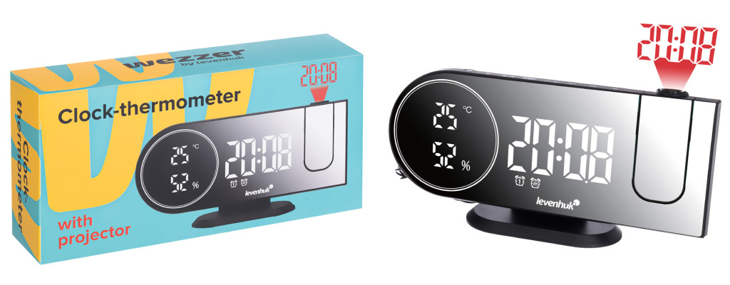 A Levenhuk Wezzer Tick H50 órával ellátott hőmérő biztos, hogy a kedvenc készüléke lesz. Az eszköz meglehetősen stílusos kivitelezéssel készült: Az LCD-tükrös kijelző fekete színű, amelyen kontrasztos, egyszerű számjegyek találhatók. FM-rádió, hőmérő és páratartalom-mérő is található benne, az idő pedig forgó kivetítő segítségével a mennyezetre vagy a falra is kivetíthető. Ezenfelül erről az óráról még az okostelefonját is fel tudja tölteni. A hátsó panelen a mobileszközök töltésére szolgáló USB-csatlakozó van.