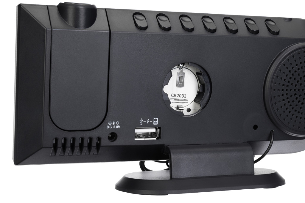 A vezérlőgombok a hátsó panelon helyezkednek el, így nem rontják le az elülső panel dizájnját. Az eszköz váltakozó áramú tápellátásról működik. Az óra kizárólag asztalra helyezhető el.