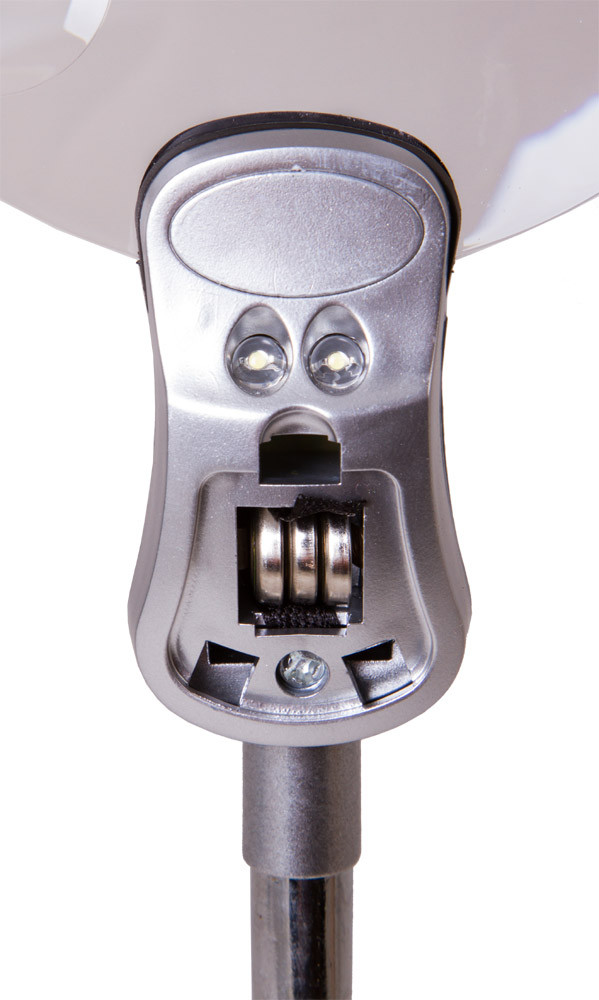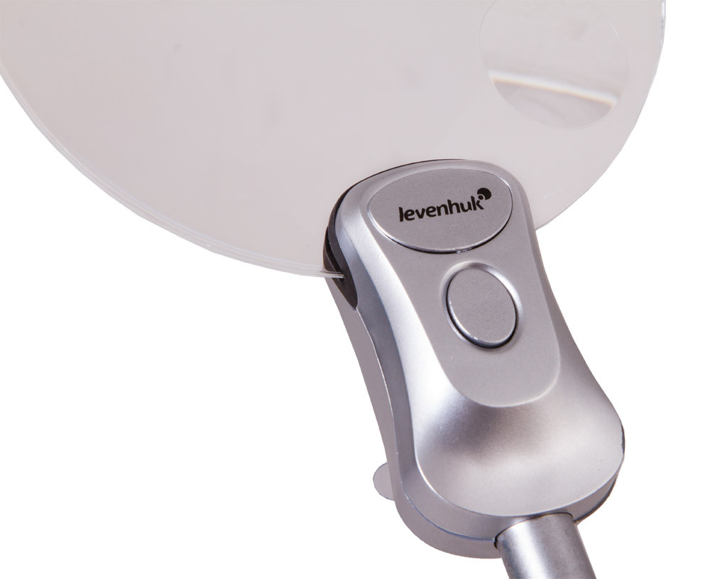 A Levenhuk Zeno Desk D5 nagyító egy bifokális lencséből és egy rugalmas fémnyakból áll. Ez a szerkezet fixen egy kör alakú alaphoz van rögzítve. Két fénykibocsátó dióda világítja meg fényesen és egyenletesen a látómezőt. A világítást a keret felső részén található gombbal tudod bekapcsolni.