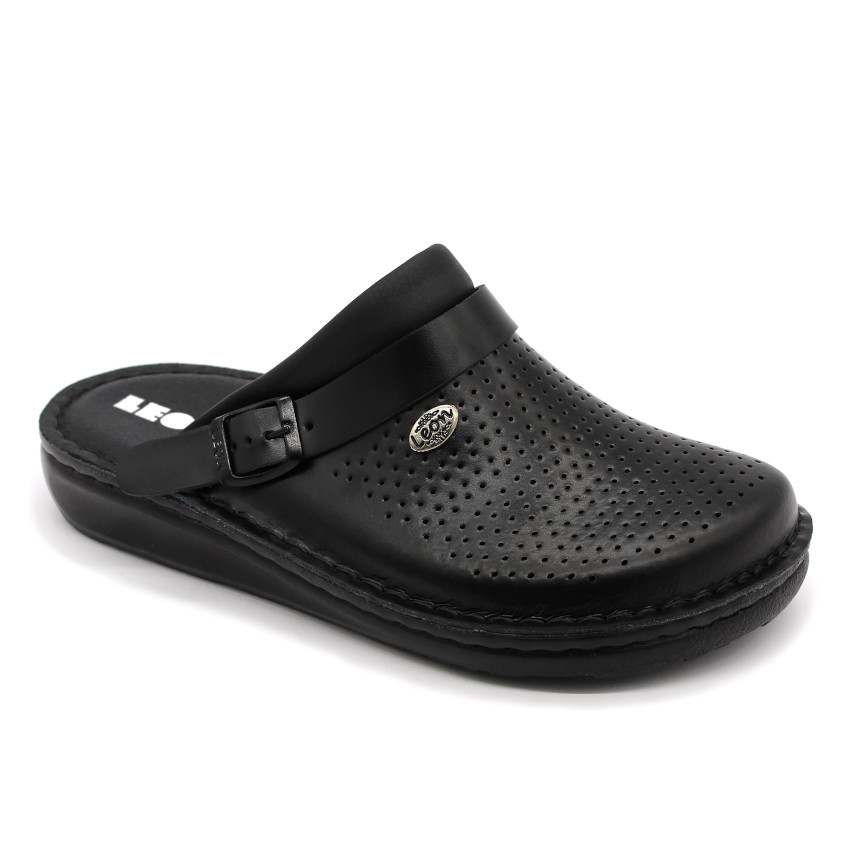 Férfi bőr klumpa, műanyag csúszásgátlós talppal. A felsőrész bemeneti nyílásánál, szivacsos szegő található, a komfortosabb érzetért. A szíj hátrahúzható a sarokhoz, így szandálnak is használható. A talpbetét puha, zselés bőr. A természetes anyagnak és a felsőrész lyukacsosságának köszönhetően, jól szellőzik. Ajánlott: mindennapos utcai használatra, otthonra vagy munkahelyre ( több órás, szaladgálós munka alatt sem fárad el a láb ). Ez a termék rendelkezik munkavédelmi bevizsgálással.
